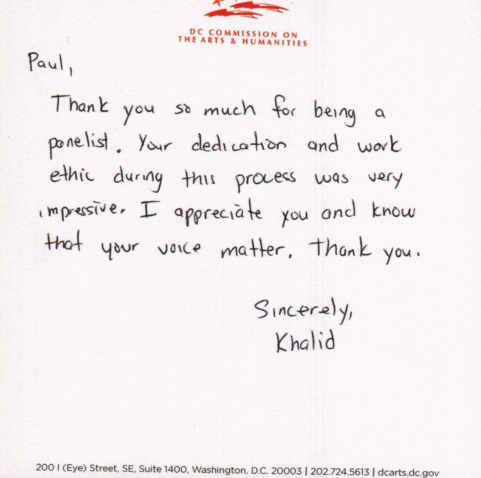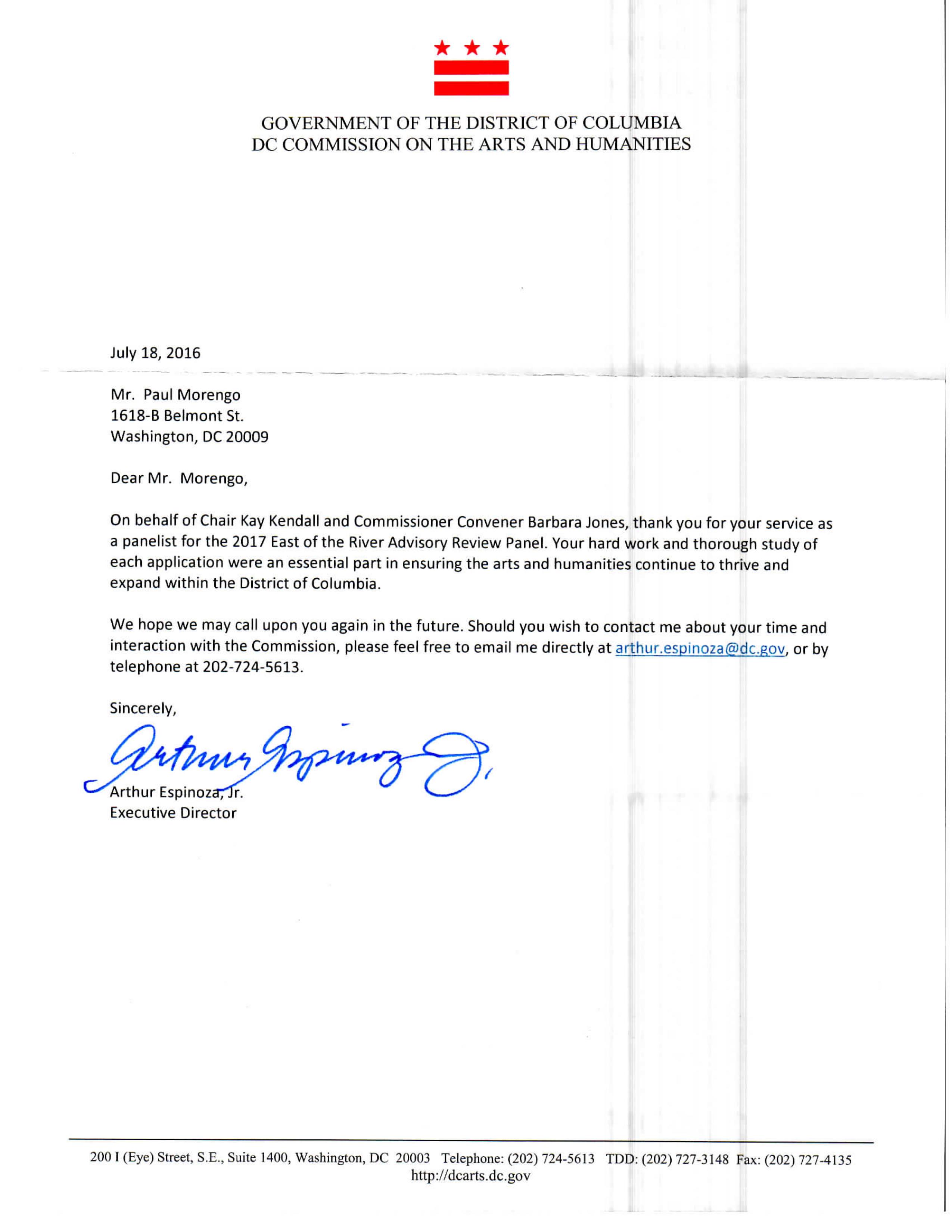 Thank You Letter from the DC Commission for the Arts and Humanities
